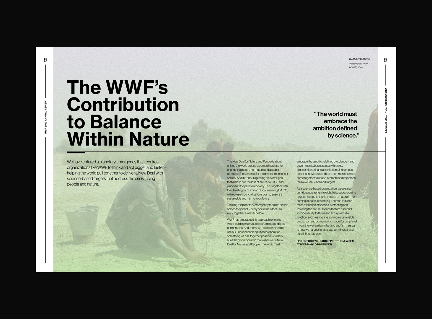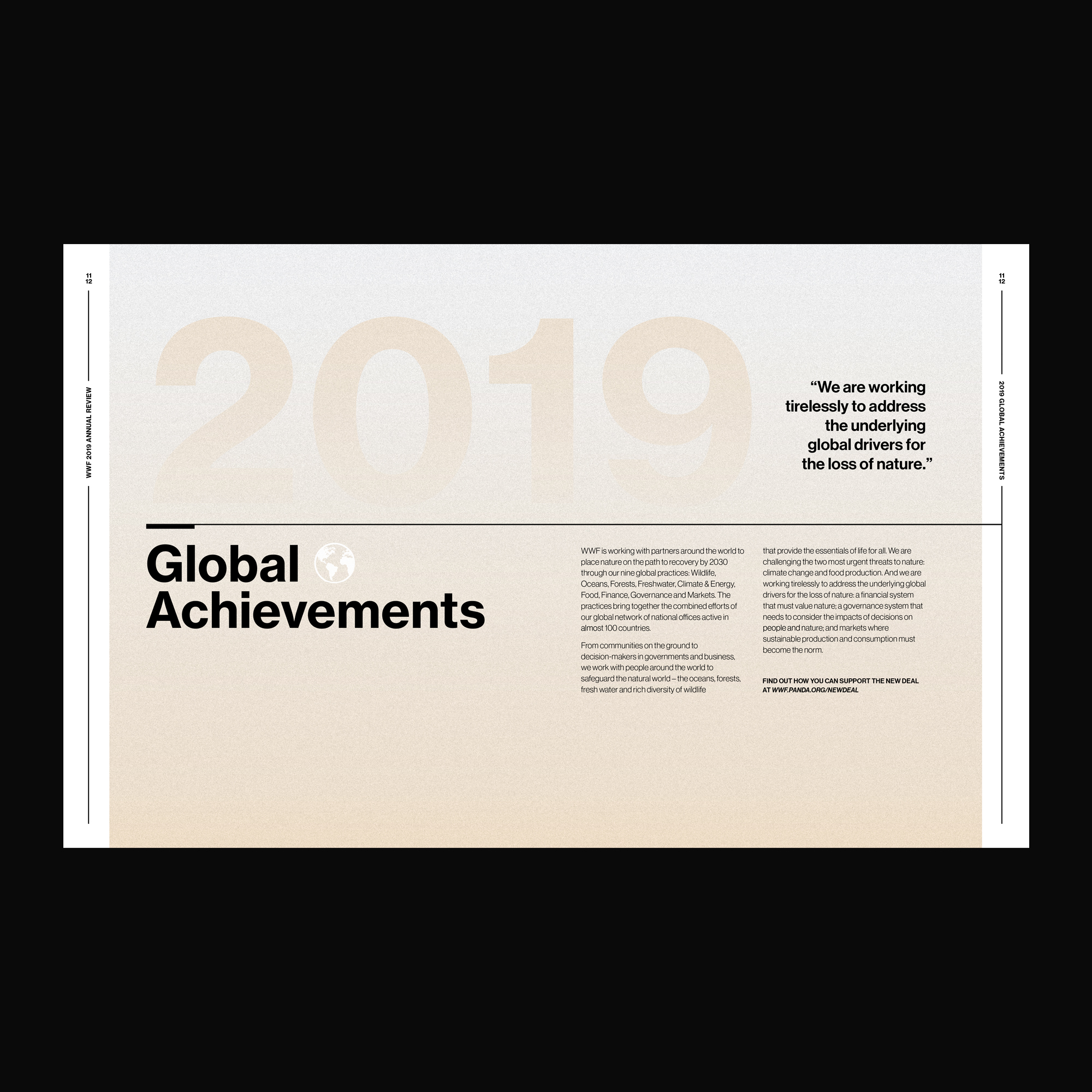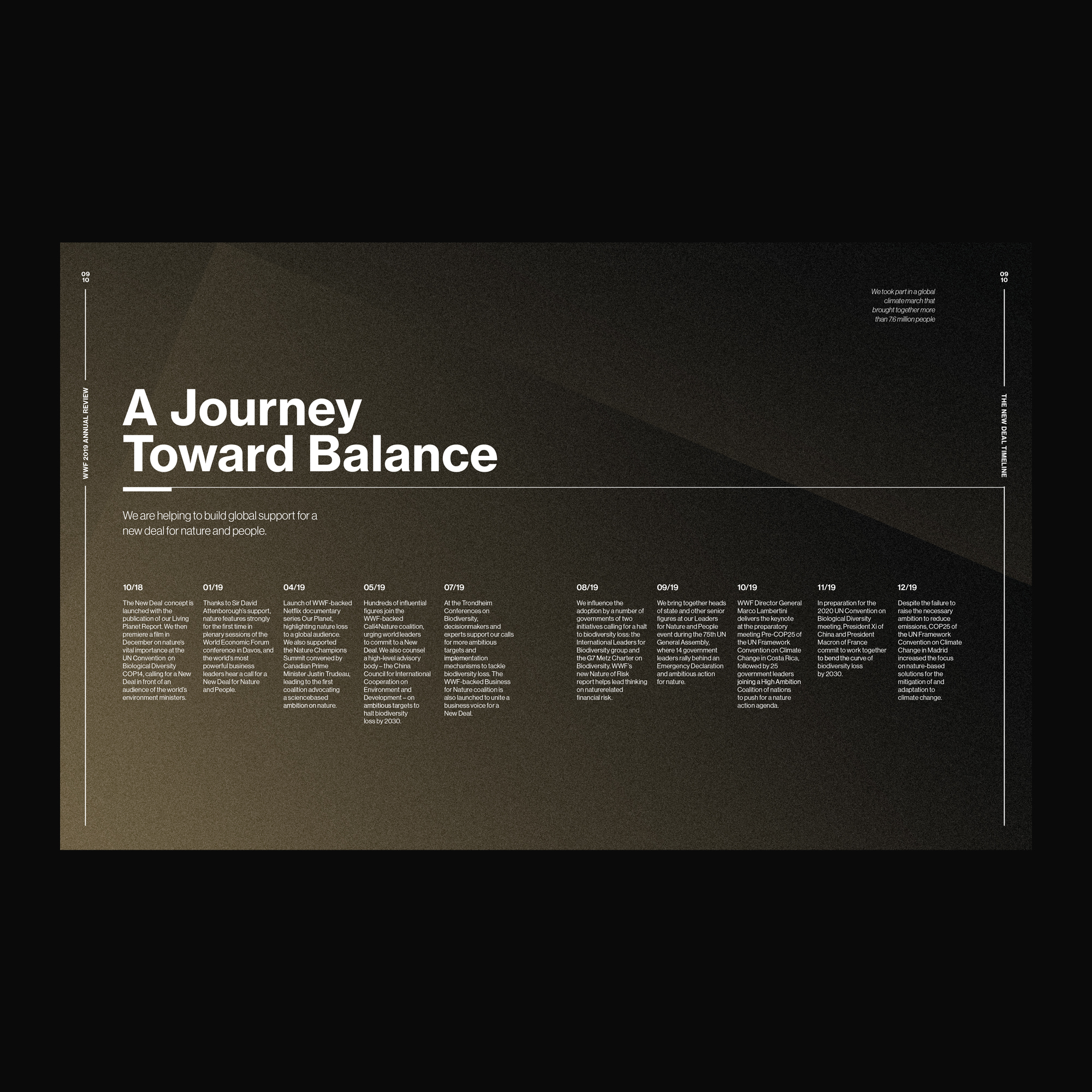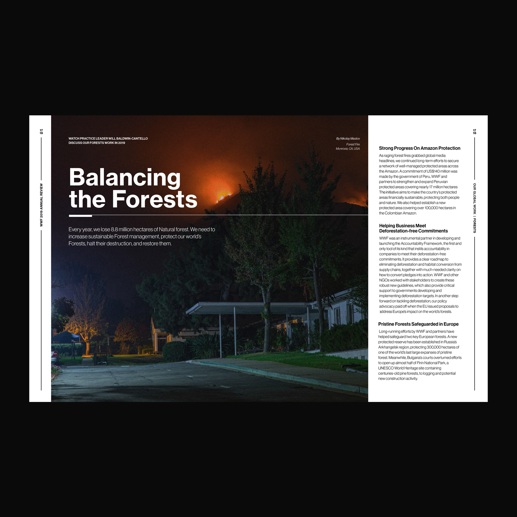 The World Wide Foundation is an international non-governmental organization founded in 1961 that works in wilderness preservation and the reduction of human impact on the environment. For their 2020 Annual Review I introduced the idea of returning to balance. The colors and layout bring a peacefulness while complimenting the headlines that discuss balance within nature. I was responsible for this entire project, including the layout design, content curation, and headline copywriting.
